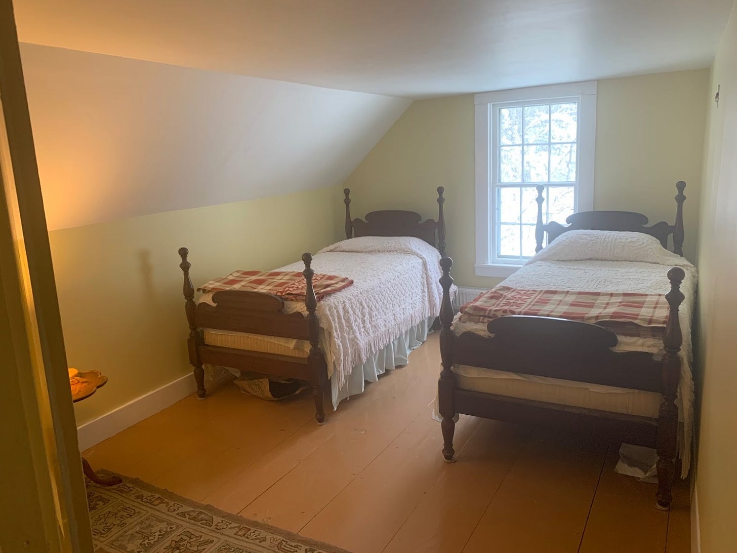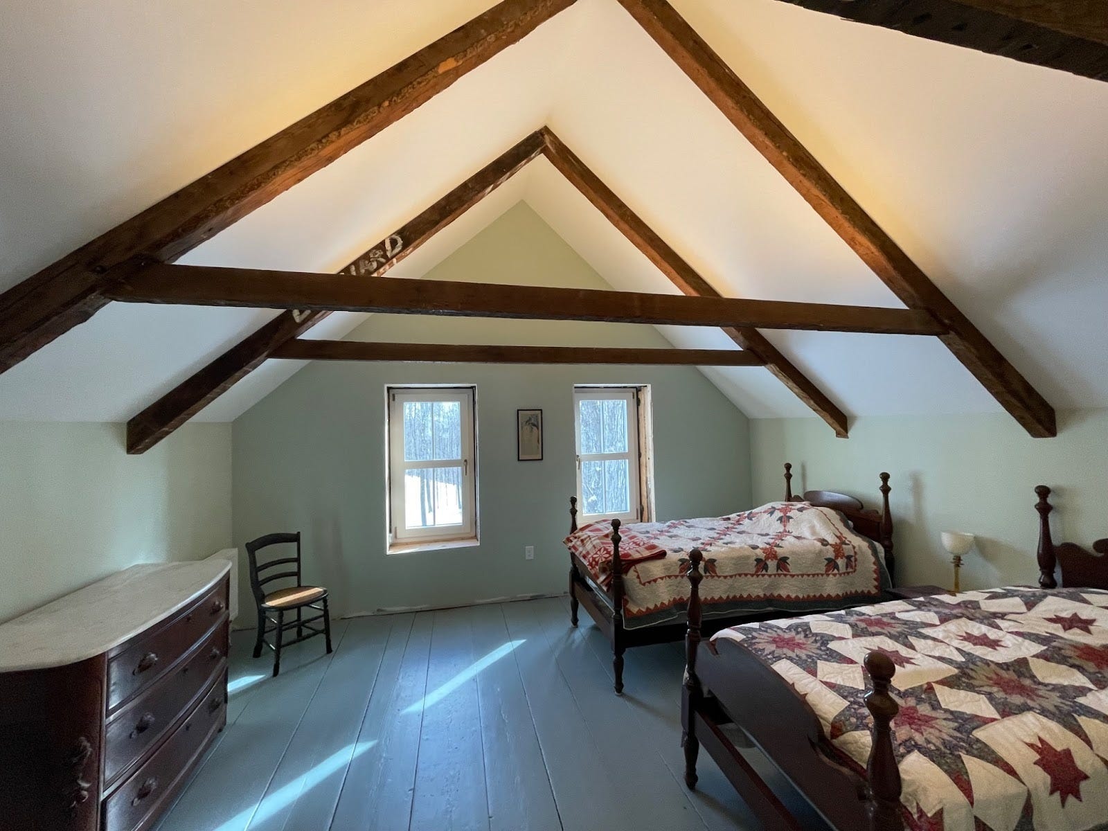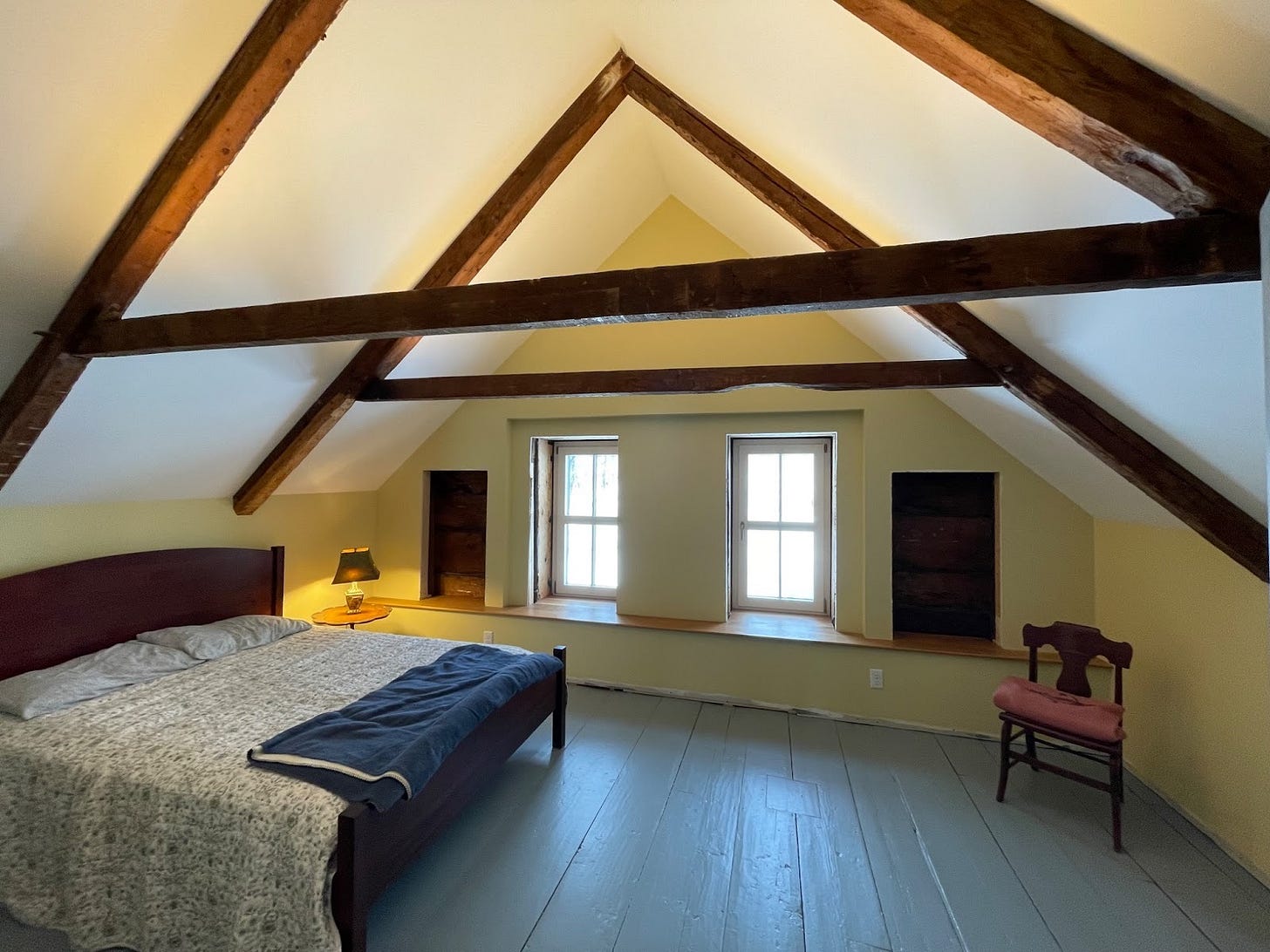 And this was the bedroom below. Cozy. Low ceilings. Modest amount of light. The old bathroom was on the other side of the wall to the right.