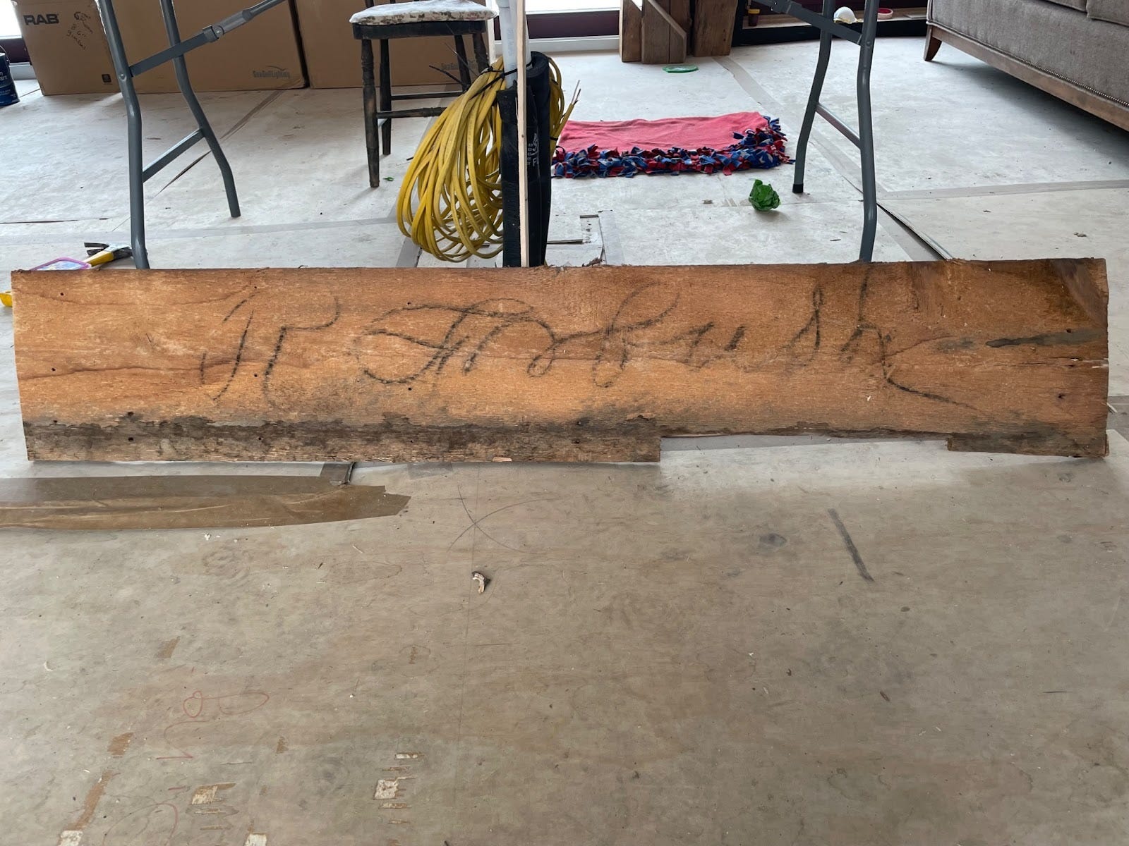 One of the pieces of subfloor had a name written on it–”R. Forbush”. I have written extensively about Rufus Forbush (the 1812 war veteran, who inherited the house from his father, Rufus, who bought the house from Moses Chaplin, who built the original house ). We don’t know which Rufus this was, but my money is on the son, as he did quite a bit of remodeling in the 1830s.