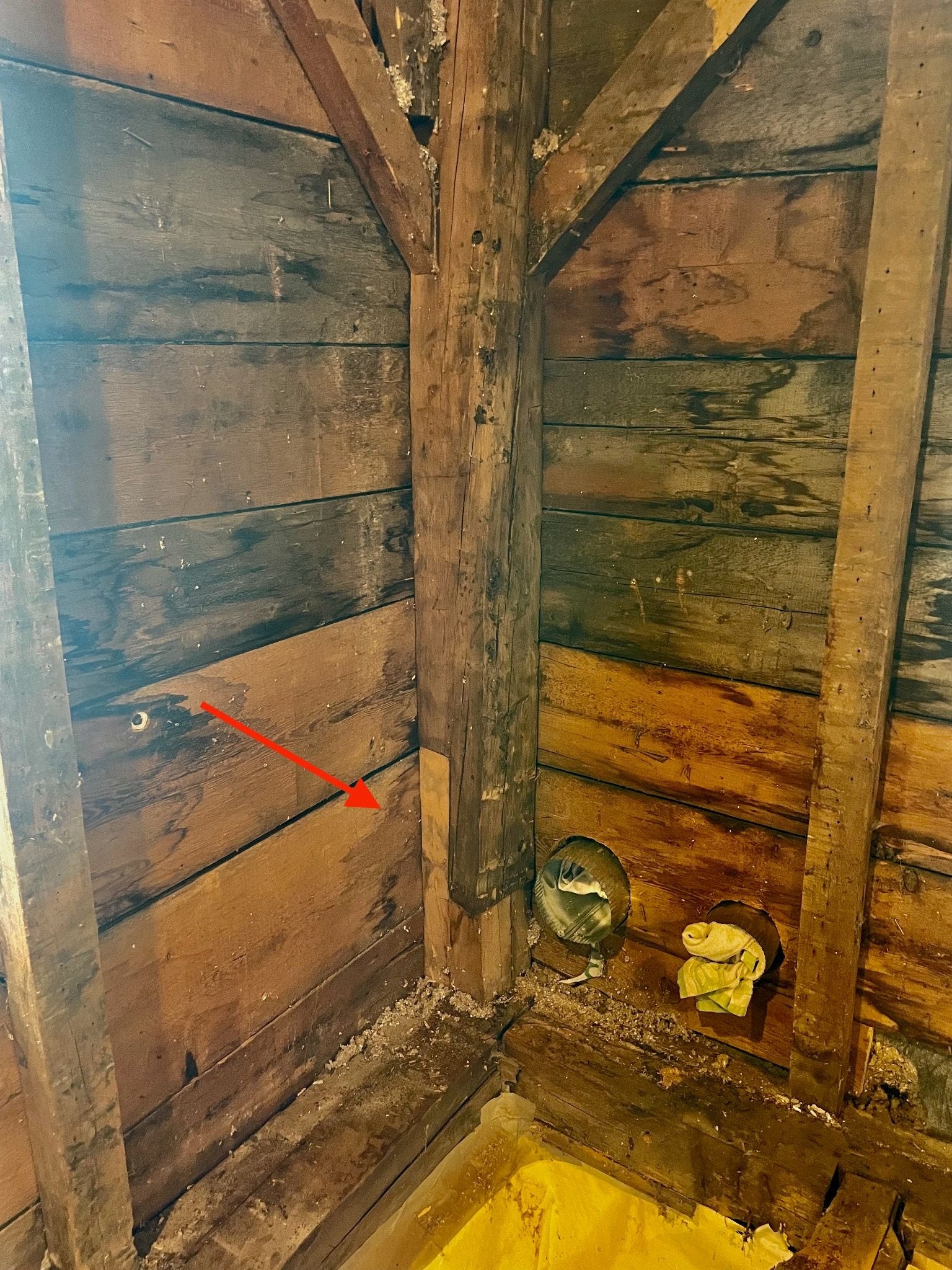 We were surprised to discover that every post from the original timber frame had an added extension at its lower end (as in the corner post above, denoted by the red arrow). We had seen one or two of these earlier on and assumed it had been a repair. The fact that all of the posts had this same “scarf joint” extension suggested that, instead of repair, they had raised the height of the whole first floor by about 14 inches! Two other bits of evidence bear this out: (1) Gary found a reused piece of wood in one of the walls that had tenons on both ends that is exactly the height of what a stud would have been before they raised the height of the first floor, and (2) the studs currently in between the major posts in the exterior walls were all newer looking and a different wood than either the original timber frame or the shorter stud we found. So….that’s wild! I would love to know how they pulled this off.