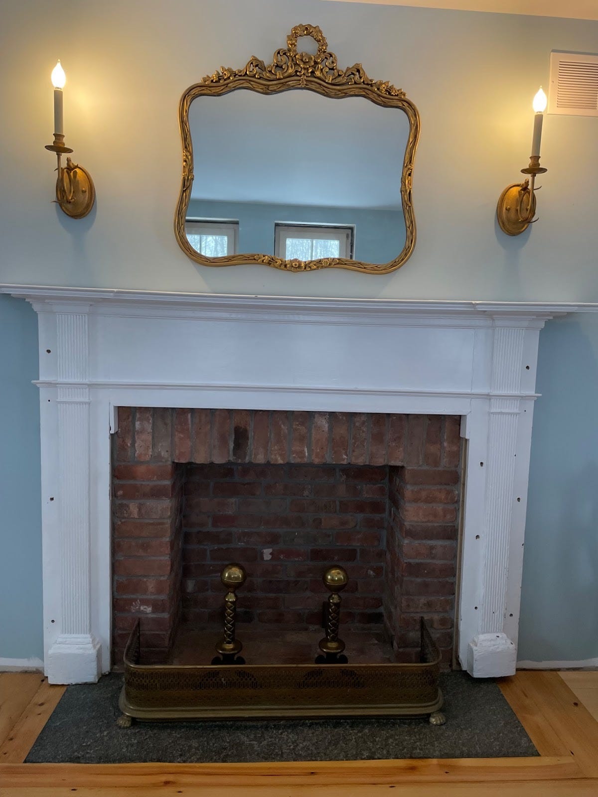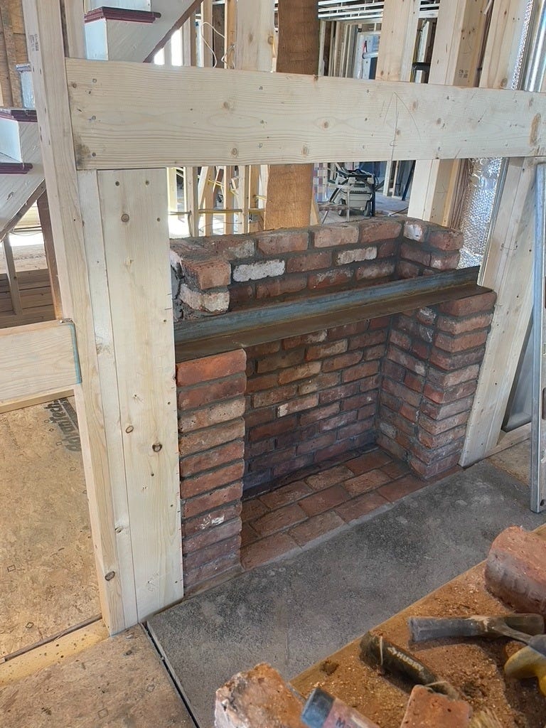 The very talented mason Greg, from JT Dow Services –who has done extensive work throughout the project on a retaining wall, patio, the wood stove chimney exterior, etc.--recreated a fireplace firebox, hearth and lintel to bring back the aesthetic of the fireplace that was removed. Shout out to Jason for finding reclaimed bricks from a warehouse demo to give the feel of an older fireplace.