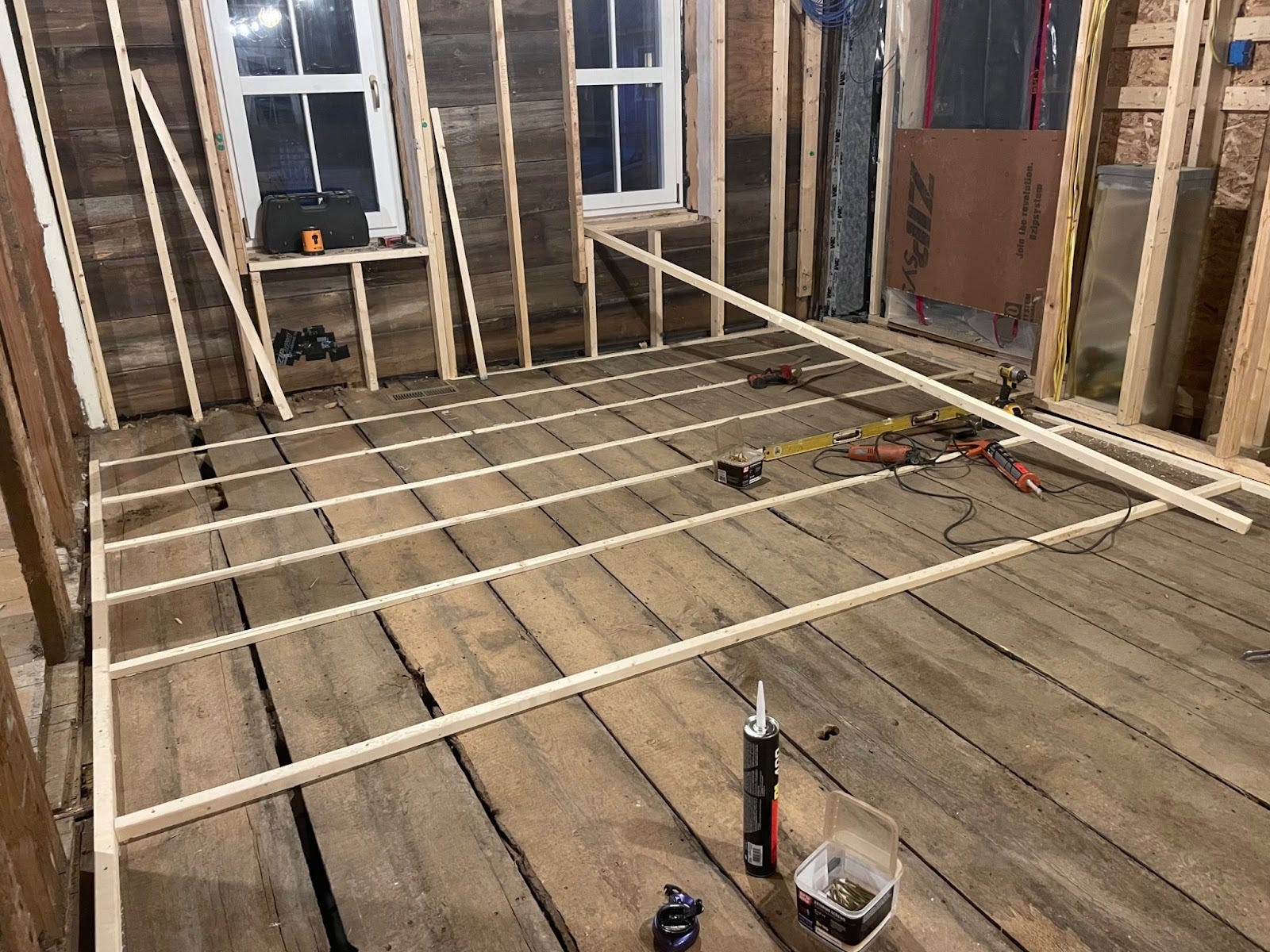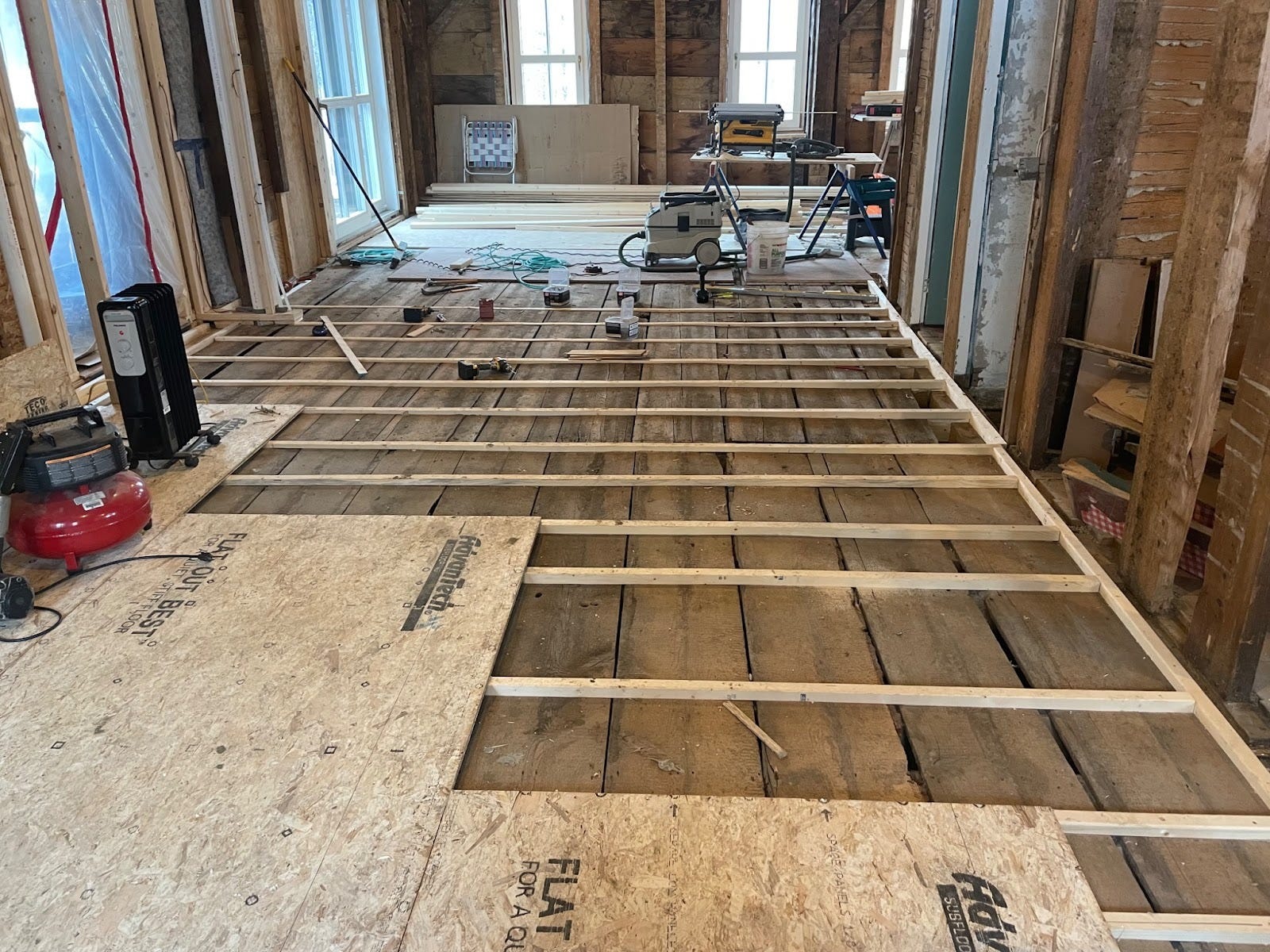 The north side of the den (shown here) was the high point of the first floor–so Garrett and Gary took out the original subflooring to lower the plane, then added back the height they wanted with sleepers on the joists. While they were at it, they added some more joists for good measure.