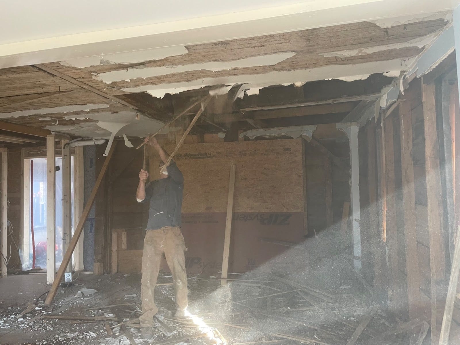 Garrett going after the ceiling in the living room. It had a layer of plaster and lathe, and then strapping, and then a layer of sheetrock over that. And a lot of mouse….leavings. Like 240 years worth. We were happy to be rid of those! And, if you are thinking this is an opportunity for ceiling height gain…you’re right!