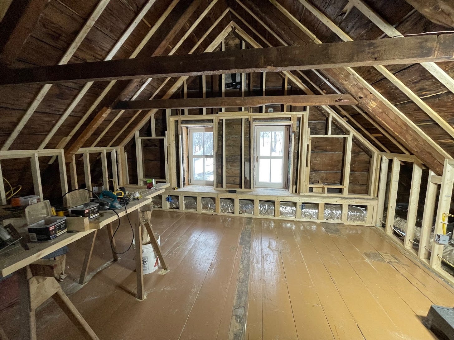 This is the new north bedroom, mid-framing. The attic space from the above picture is now part of the framed room. The mark down the middle of the floor shows where the wall that separated the bedroom and bathroom was before this renovation (a new bathroom was added in at the top of the stairs–details in a separate post). Garrett and Gary built a chase underneath the windows to hide a duct (the bright silver of the duct insulation can be seen in the chase). That duct is the make-up air vent for the kitchen hood. When the kitchen vent hood is turned on, a baffle at the exterior penetration of that duct opens up, allowing air to passively enter to balance the air being expelled by the kitchen hood. That is necessary in a well air-sealed home to prevent negative pressure or backdraft.