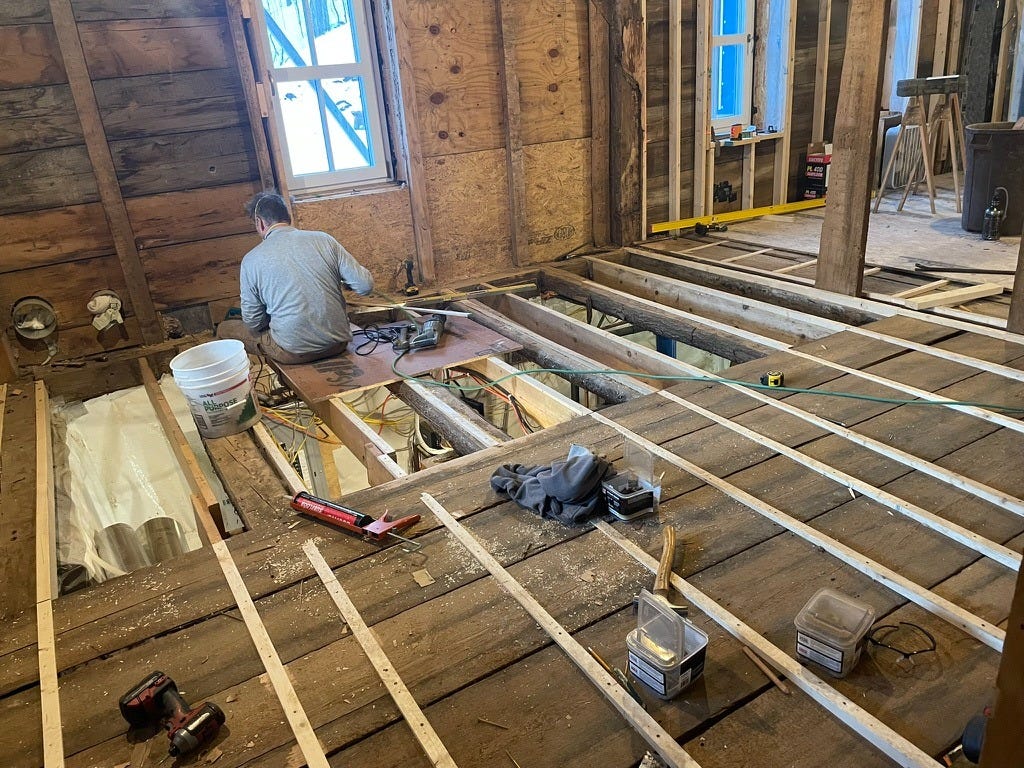 He was also saying I should probably call Genuine Wood Floors and tell them we needed to reschedule the install so we could get the work back into a sequence that made sense: subfloor, then framing walls and ceiling, then sheetrock (and ideally some painting), and THEN floors.