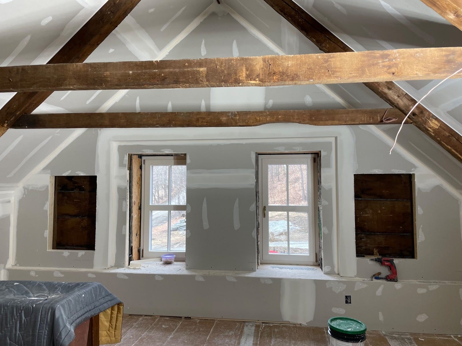With the north wall sheetrocked, the duct is hidden, and a deep window seat begins to take shape.