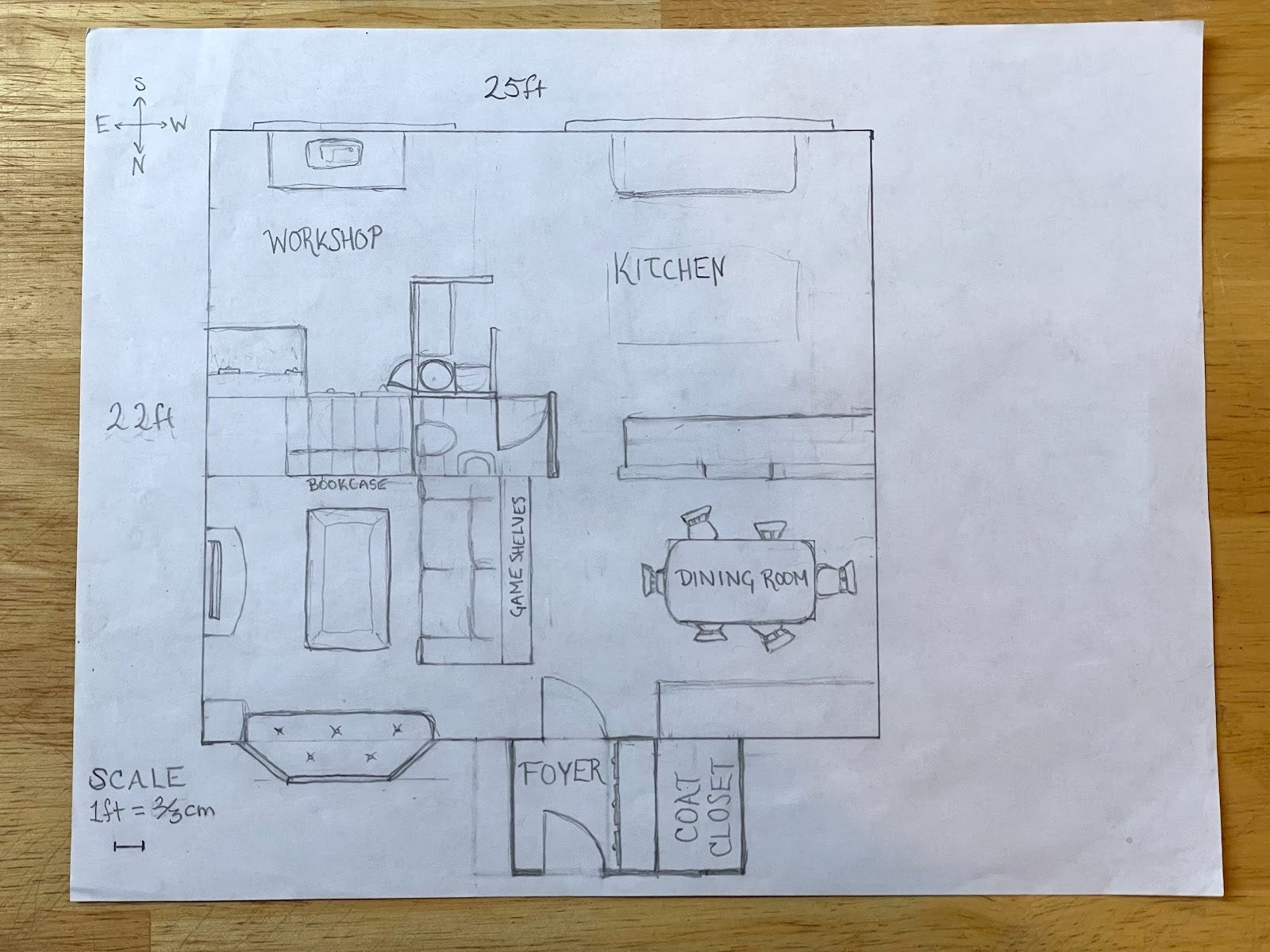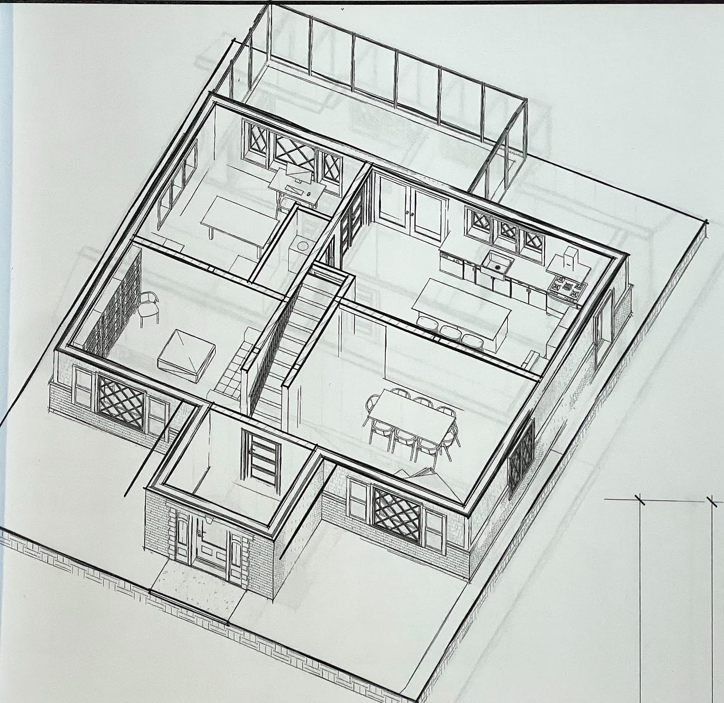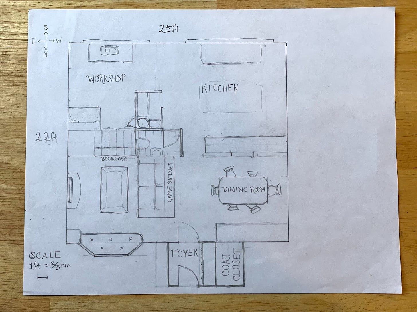 When my husband Jay and I started designing our house, we had only been together for maybe a year, in 2018, but it was an exciting dream we shared. We knew we wanted certain elements, and quickly came up with a sketch (this is of the ground floor only).
